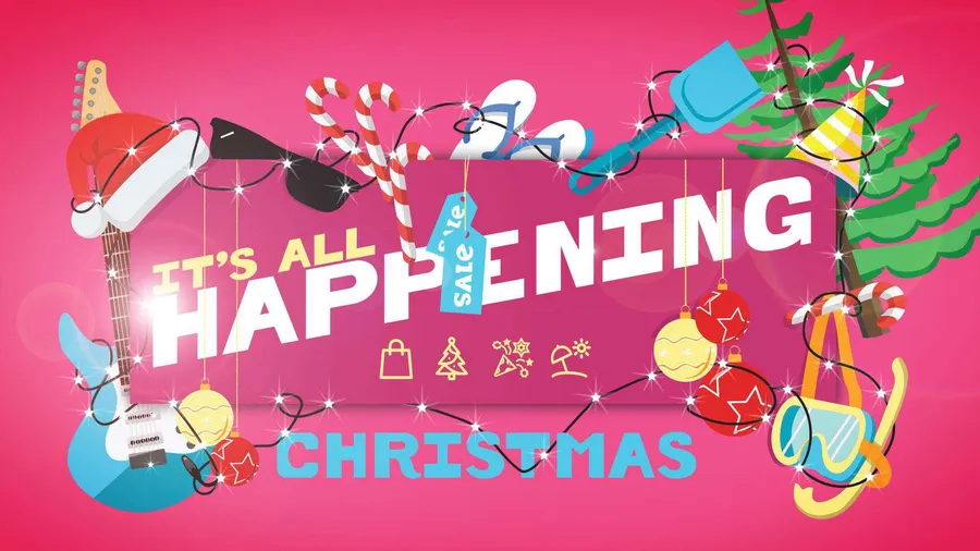 Sebuah Spanduk Pink Cerah Dengan Teks "it's All Happening Christmas" Dikelilingi Oleh Ikon Meriah Seperti Tongkat Permen, Pohon Natal, Dan Alat Musik, Menunjukkan Acara Penjualan Liburan.